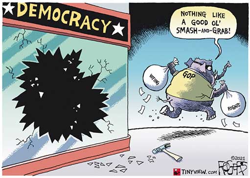 Republicans have practically fallen over themselves in a rush to enact laws that limit or dilute the voting power of Americans of color — who, not coincidentally, tend to vote for Democrats. They limit the number of polling places in selected neighborhoods so that voters of color have to wait in long lines. They try to structure rules on early and absentee voting in ways that disadvantage minorities. They draw congressional district boundaries to dilute the Black and Hispanic vote — and do the same with state legislative districts so that Republicans can continue to be the ones who make, and distort, election rules.