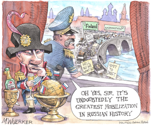 Sen. Ron Johnson (R-WI) is “the worst Wisconsin political representative since the infamous Sen. Joseph McCarthy.” — A Milwaukee Journal Sentinel editorial. https://www.jsonline.com/story/opinion/2022/10/12/ron-johnson-has-no-business-being-wisconsin-senator-any-longer-editorial/7888310001/Russia is a dangerous place to take a fall. Every year, Russian citizens are killed by accidental falls, either out of windows or down staircases. I do not want to tell Vladimir Putin how to run his country, but really: He should set up some version of OSHA to make windows and stairs safer for Russian VIPs. Russia is such an perilous place that it’s worth considering what might happen if Putin himself were to slip and fall out of a window. -- Jonathan Last https://thetriad.thebulwark.com/p/what-happens-if-putin-falls-out-of