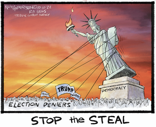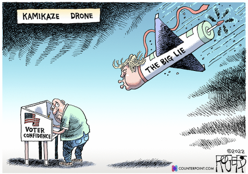 As the United States enters the final stretch to November’s midterm elections, Reuters documented multiple incidents of intimidation involving an expanding army of election observers, many of them recruited by prominent Republican Party figures and activists echoing Trump’s false theories about election fraud.” https://www.reuters.com/world/us/stop-steal-supporters-train-thousands-us-poll-observers-2022-10-13/