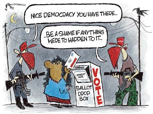 Two people armed with handguns and wearing tactical military gear, balaclavas masking their face and the license plates on their cars covered, stood watch over a ballot drop box during early voting last week in Mesa, Arizona.This scene, reported by the Maricopa County Elections Department on Friday, is one that some elections officials and law enforcement fear might spread as believers in Donald Trump’s false claims that a second term as president was stolen from him through voter fraud amp up activity ahead of the Nov. 8 election. https://www.bloomberg.com/news/articles/2022-10-27/masked-poll-watchers-are-showing-up-at-voting-sites-with-handguns-and-kevlar-vests