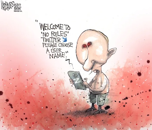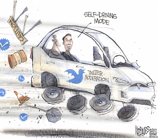 entering an era of hateful speech.Twitter has long wrestled with how to enforce content policies fairly on its platform in order to appease the advertisers, users and powerful world leaders that use its service. But as Musk, a self-styled ‘free speech absolutist,’ took over ownership of the company, some conservative officials, partisan extremists and conspiracy peddlers saw reason to celebrate the change. https://www.bloomberg.com/news/articles/2022-10-29/musk-s-twitter-roils-with-hate-speech-as-trolls-test-new-limits