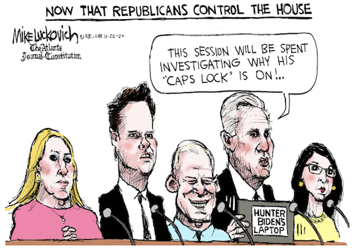 Despite their tepid midterm performance, Republicans have been giddy about their forthcoming House takeover. Kevin McCarthy, who stands to become speaker, is vowing to remove Democrats Ilhan Omar, Adam Schiff, and Eric Swalwell from their committee assignments—a thinly-veiled act of retaliation for the removal of right-wing extremists Marjorie Taylor Greene and Paul Gosar from theirs. Greene, who McCarthy says he'll allow to serve on committees again, is eager to use her rising influence in the caucus to push for audits into Ukraine funding as well as the political impeachments of Merrick Garland and other administration officials, including President Joe Biden himself. Meanwhile, Jim Jordan is already rolling up his sleeves as he and other right-wingers prepare to use their newfound committee power to investigate everything from the Justice Department's raid of Mar-a-Lago to Hunter Biden’s business dealings.