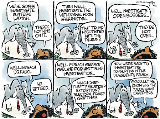 The House GOP is framing all this nonsense as legitimate oversight. But the party's actual agenda is much more sinister: to inflict as much political damage on Biden and the Democrats as possible while providing cover for Donald Trump and others on the MAGA right. It’s going to be chaos with Republican leadership, as Schiff told ABC News over the weekend.
