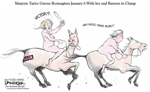“I want to tell you something, if Steve Bannon and I had organized that, we would have won. Not to mention, we would’ve been armed.” — Rep. Marjorie Taylor Greene (R-GA), quoted by the New York Post, on the January 6 Capitol riots. https://nypost.com/2022/12/11/marjorie-taylor-greene-donald-trump-jr-bash-dems-at-gop-gala/