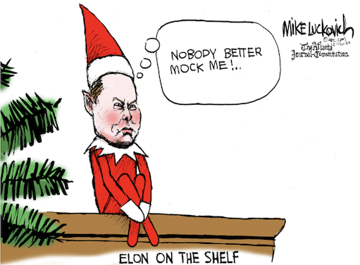 “It’s almost as if I’ve offended SF’s unhinged leftists … but nahhh.”-- Elon Musk commenting on being booed at comedian Dave Chappelle’s show. https://www.nbcnews.com/tech/internet/chappelle-elon-musk-dave-video-audience-members-boo-rcna61330“Fool us once, shame on you. Fool us 1,438 times, and it may finally be too much.” -- A New York Post editorial calls Donald Trump a con artist after his “major announcement” releasing $99 digital trading cards. https://nypost.com/2022/12/15/dont-give-any-money-to-con-artist-trump/