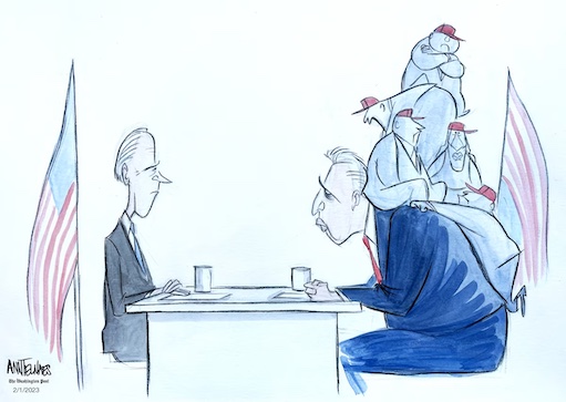 “There’s also a secret three-page addendum that McCarthy and his allies hashed out during several days of grueling negotiations with the House Freedom Caucus. This pact includes the most controversial concessions McCarthy made in order to become speaker – three seats on the Rules Committee for conservatives, freezing spending at FY2022 levels, a debt-ceiling strategy, coveted committee assignments and more. https://punchbowl.news/archive/1923-punchbowl-news-am/