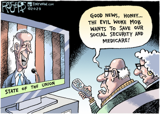 “Clearly, having the House Republican caucus behaving the way they are, and are signaling strongly they will continue to behave, is going to give the president an easy contrast. What the House Republican caucus is doing for him is giving him a way to draw a contrast between what he is for — what he’s trying to get done, and who he’s trying to get it done for — with the House Republicans.” — White House adviser Anita Dunn. https://www.nytimes.com/2023/02/09/us/politics/biden-florida-medicare-social-security.html