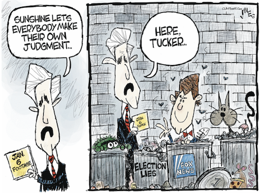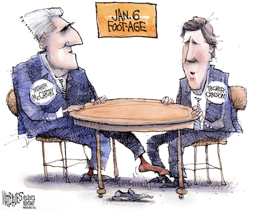 Now consider Jan. 6. McCarthy knows the facts. The Capitol insurrection wasn’t a false-flag operation by antifa or the FBI. Indeed, McCarthy initially blasted Trump for his role in stirring the rioters and dismissed conspiracy theories. So why has he given exclusive access to surveillance footage to Carlson, the constant purveyor of conspiracy theories?There’s no mystery. Carlson’s producers will comb through endless pixels to find images with which to mislead viewers: to convince them that the riot wasn’t so bad or that Trump’s supporters weren’t to blame or that the whole thing was a setup.