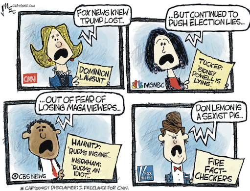 Dominion said the emails and texts show that Fox’s hosts and executives knew the claims being peddled by then-president Donald Trump’s lawyers Rudy Giuliani and Sydney Powell weren’t true — some employees privately described them as ‘ludicrous’ and ‘mind blowingly nuts’— but Fox kept airing them to keep its audience from changing channels. https://www.washingtonpost.com/media/2023/02/23/fox-news-dominion-lawsuit-legal-analysis/