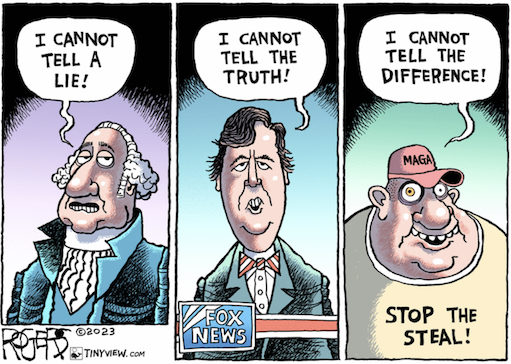 Who taught that audience to believe conspiracy theories and to assume that any unwelcome information must be a sinister lie? Fox News, of course. https://www.washingtonpost.com/opinions/2023/02/24/republicans-fox-dominion-carlson/