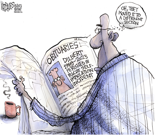 Newspapers across the United States have pulled Scott Adams’s long-running “Dilbert” comic strip after the cartoonist called Black Americans a “hate group” and said White people should “get the hell away from” them. https://www.washingtonpost.com/media/2023/02/25/scott-adams-dilbert-canceled/VERSUS