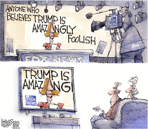 Fox’s stars did all of this while privately communicating with one another and rolling their eyes with contempt, admitting without a shred of shame that they were lying through their teeth. From Rupert Murdoch on down, top Fox personalities have admitted that they fed the rubes all of this red, rotting meat to keep them out of the way of the Fox limos headed to Long Island and Connecticut.