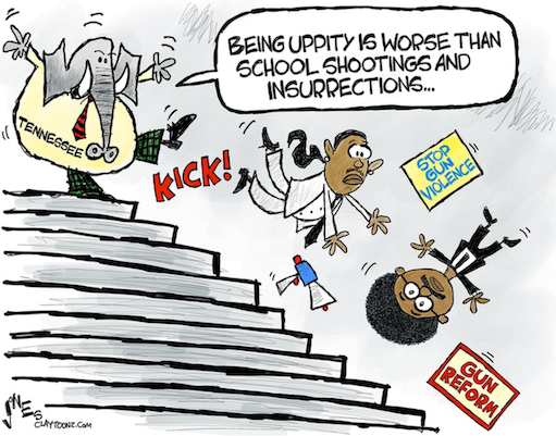 The case of the two Tennessee Democrats involves neither criminal nor immoral conduct nor the mere statement of opinions. It involves conduct — encouraging demonstrations and bringing a bullhorn and posters to the state House floor — that violates the rules of the House. Still, the legislature has never imposed before so severe a penalty for rules violations, and over the past few years, a number of legislators have kept their posts even after being charged with serious sexual misconduct.