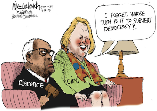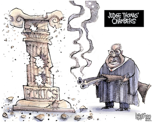 In 1969, Supreme Court Justice Abe Fortas resigned after it was learned that he had accepted, then returned, $20,000 from a Wall Street financier. At the time, Chief Justice Earl Warren felt it was important that Fortas step down to preserve the court’s reputation.Clarence Thomas accepted gifts from Crow worth many times that amount, even counting for inflation, and failed to report them. And then there is all the money Ginni Thomas has received from right-wing organizations that lobby on issues before the court — plus her outrageous involvement in the “Stop the Steal” putsch that led to the Jan. 6, 2021, Capitol insurrection.