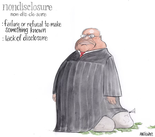 “Justice Thomas’s acceptance of and failure to disclose these repeated, lavish gifts and shocking real estate sales not only undermines public trust in his ability to serve impartially on the Court, it undermines confidence in the Supreme Court as an institution.” —- CREW President Noah Bookbinder who filed a civil and criminal complaint against Clarence Thomas. https://www.citizensforethics.org/legal-action/legal-complaints/crew-files-civil-and-criminal-complaint-against-clarence-thomas/