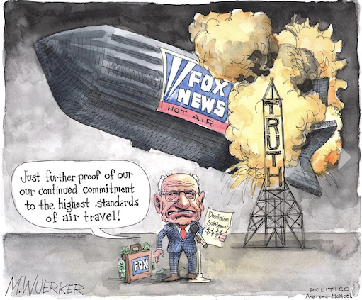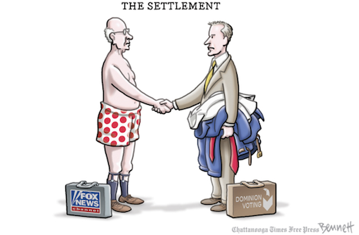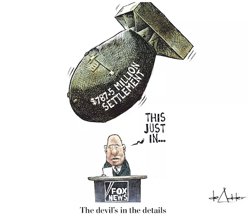 “I think that it’s a big step forward in democracy if our system can send a signal that if media companies lie — whoever they are or whatever channel they’re on — and they do so knowingly, they will be prepared to pay a very high price.” — Dominion Voting Systems CEO John Poulos. https://abcnews.go.com/US/fox-settlement-big-step-democracy-dominion-ceo/story“I can’t shake the feeling that even though Dominion has won the battle, the rest of us continue to lose the war.” — Charlie Sykes. https://morningshots.thebulwark.com/p/no-apologies-for-foxs-costly-lies