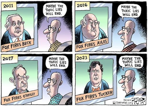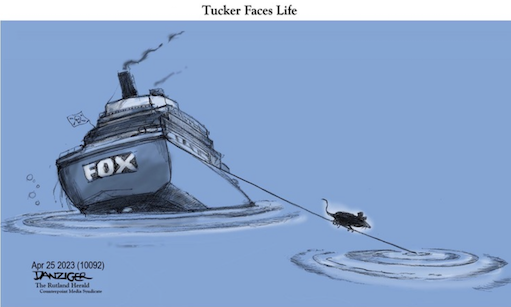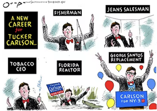 “Tucker is one of the very small number of political celebrities in this country who has the name ID, the personal wealth, the stature to actually declare and run for president and in a Republican primary run in the same track Donald Trump did: the transgressive, bad boy candidate, the one who lets you say what you want to say, think what you want to think, act how you want to act, no matter how grotesque it is… Among Republicans, he’s a beloved figure. He’s right now in the Republican universe a martyr – and there ain’t nothing they want more than a martyr.”— Former GOP strategist Rick Wilson. https://www.theguardian.com/us-news/2023/apr/27/rick-wilson-tucker-carlson-presidential-nominee-donald-trump-ron-desantis-republicans