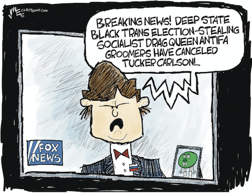 “A couple of weeks ago, I was watching video of people fighting on the street in Washington. A group of Trump guys surrounded an Antifa kid and started pounding the living shit out of him. It was three against one, at least. Jumping a guy like that is dishonorable obviously. It’s not how white men fight. Yet suddenly I found myself rooting for the mob against the man, hoping they’d hit him harder, kill him. I really wanted them to hurt the kid. I could taste it.”. — From a text message sent by Tucker Carlson that contributed to chain of events that ultimately led to Carlson’s firing on the eve of Fox’s billion-dollar defamation trial. https://www.nytimes.com/2023/05/02/business/media/tucker-carlson-text-message-white-men.html