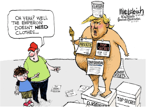 Is he so addled by narcissism that he sees no distinction between highly sensitive documents belonging to the government and papers he wants to keep? He treats classified maps and nuclear secrets and a Pentagon war plan for Iran like pelts, hunting trophies, or family scrapbook items.