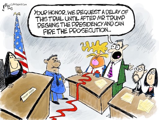 Special counsel Jack Smith’s team sharply rebuked Donald Trump’s bid to postpone until after the 2024 election his criminal trial for allegedly hoarding classified documents, characterizing the former president’s call for delay as unfounded and one of his key legal arguments as ‘borderline frivolous. https://www.politico.com/news/2023/07/13/special-counsel-trump-trial-date-00106268