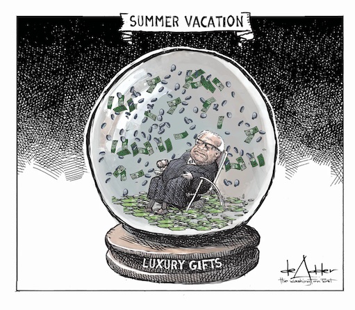 Exclusive golf club access! Sports tickets in fancy boxes! All the football you can eat! RVs! Yachts! Helicopters! It’s a miracle the justices manage to take any rights away from anyone! They are always off on vacation somewhere, on someone else’s dime — indeed, I would not call this living on someone else’s dime. There is no way a dime covers all this!