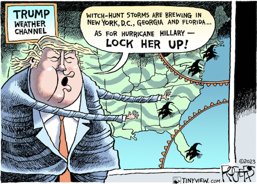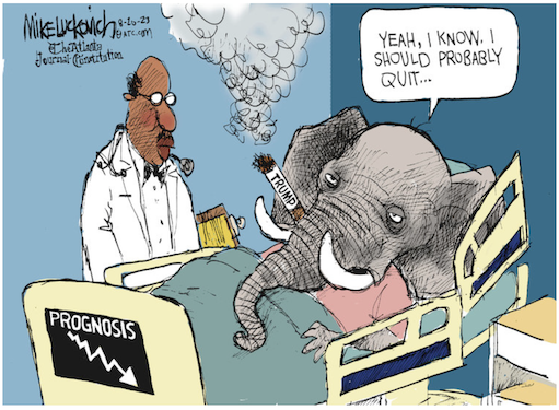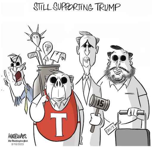 “Why doesn’t Fox and Friends show all of the Polls where I am beating Biden, by a lot. They just won’t do it! Also, they purposely show the absolutely worst pictures of me, especially the big ‘orange’ one with my chin pulled way back. They think they are getting away with something, they’re not. Just like 2016 all over again… And then they want me to debate!” — Trump on Truth Social. https://truthsocial.com/@realDonaldTrump/posts/110904845212218957“I struggled with pornography and being exposed to it at a young age. Of course, that leads to, you know, sexual sin, masturbation and stuff. And so, that was a chronic habit that I had that just became a bad habit.”— Pennsylvania congressional candidate Mark Houck (R), quoted by Politico on his “sexual sin.” https://www.politico.com/newsletters/huddle/2023/08/18/a-gop-challengers-frank-talk-about-sexual-sin-00111808