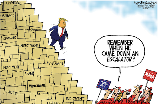 “Russian president Vladimir Putin “would have never gone into Ukraine” if he was still president … because “I was the apple of his eye.” — Donald Trump. https://twitter.com/justinbaragona/status/1692633948856394121Indictment Requiem. In a searing new satirical video, The Lincoln Project likens Donald Trump's numerous criminal indictments to a 1990s-style compilation album. https://www.youtube.com/watch?v=tMRxo_LV7K0
