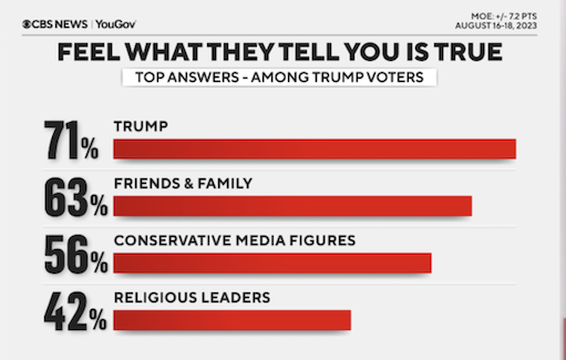 The latest CBS News/YouGov poll finds that Donald Trump’s supporters trust him more than religious leaders, more than conservative media figures and even more than their own friends and families.The question wasn’t about a specific issue or event. It wasn’t about Trump’s legal problems.