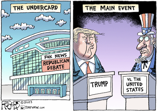 Watching these hopelessly outmatched candidates, I kept thinking back to one of the great lines from last summer’s January 6th hearings in the House of Representatives. Trump’s former campaign manager, Bill Stepien, described how, after the 2020 election, he and others had been part of Team Normal, those who tried and failed to convince Trump that he had really lost the election, only to find themselves pushed aside in favor of Team Crazy, whose members, led by Rudy Giuliani, aided and abetted Trump’s lies about the rigged election. The Republican debate stage in Milwaukee this week was filled with candidates who came from what passes for Team Normal in today’s G.O.P., figures such as Trump’s former Vice-President, Pence; Trump’s former U.N. Ambassador Haley; and Trump’s former friend and adviser Christie.