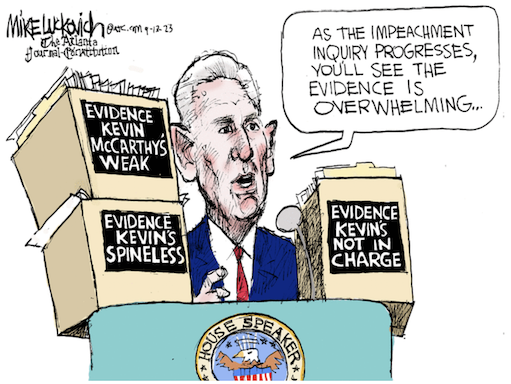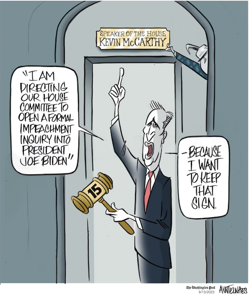 This Tuesday, McCarthy stood alone at a lectern and declared that three GOP-led committees would begin a formal impeachment inquiry, at his sole direction. https://www.axios.com/newsletters/axios-sneak-peek-23fd9c7f-71a9-43d6-b0c1-50ec681482c4.html