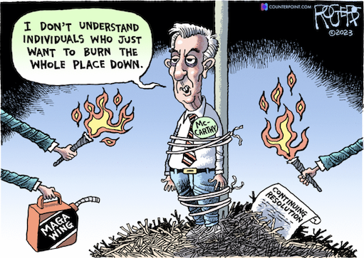 “If McCarthy pursues the hard-right approach favored by Rep. Matt Gaetz (R-FL) and a handful of other members — passing GOP-written bills packed with spending cuts and conservative policy riders — it is dead on arrival in the Democratic-controlled Senate. A shutdown is inevitable.” https://www.politico.com/news/2023/09/25/kevin-mccarthys-shutdown-matt-gaetz-00117896