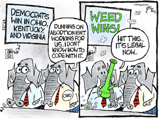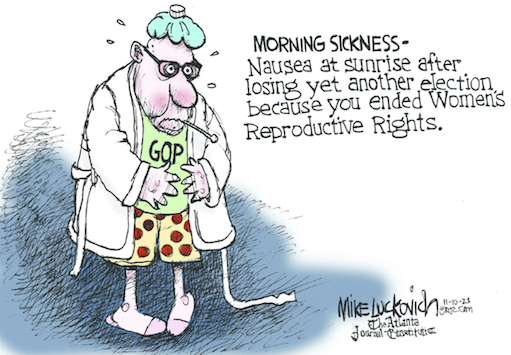 “Suburban America left the GOP in 2016 when they didn’t like Trump’s behavior. They began to come back in 2022 when they rejected Joe Biden’s economic policies, but they will leave again if the conversation is about abortion and social policy.” — GOP pollster Frank Luntz. https://www.nytimes.com/2023/11/09/us/politics/election-suburbs-abortion-immigration.html