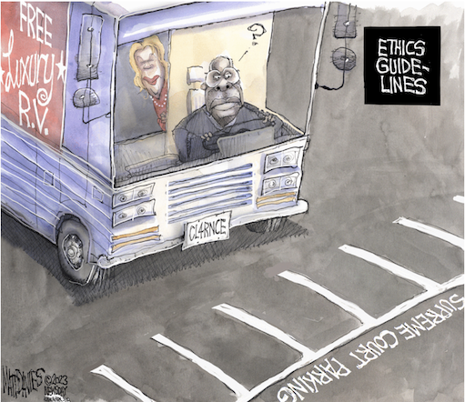 the Supreme Court’s new code of conduct.Although critics have called the Court’s new rules “toothless” and “unenforceable,” the strain of regulating his own behavior forced Thomas to repair to his bed, from which he spoke to reporters.