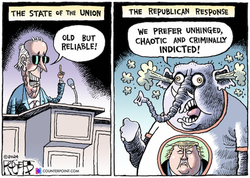 Congress, it turns out, is an appealing backdrop for a campaign rally. And there is nothing that this President likes more than to extol the virtues of infrastructure spending and union manufacturing jobs before a cheering crowd in the packed House chamber. With his Presidency on the line, no one was going to accuse this eighty-one-year-old of a geriatric showing when it mattered. https://www.newyorker.com/news/letter-from-bidens-washington/so-much-for-sleepy-joe-on-bidens-rowdy-shouty-state-of-the-union Philip