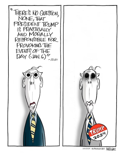“Mr. President, January 6 was a disgrace. American citizens attacked their own government. They used terrorism to try to stop a specific piece of domestic business they did not like. Fellow Americans beat and bloodied our own police. They stormed the Senate floor. They tried to hunt down the Speaker of the House. They built a gallows and chanted about murdering the Vice President. They did this because they had been fed wild falsehoods by the most powerful man on Earth because he was angry he lost an election. Former President Trump’s actions preceding the riot were a disgraceful disgraceful-dereliction of duty. …..” — Sen. Mitch McConnell (R-KY), three years before he endorsed Donald Trump for president again. https://twitter.com/RpsAgainstTrump/status/1765402675795870079