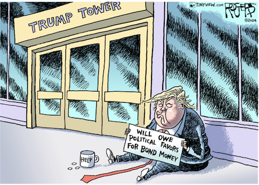 Recall the timeline. In mid-February, Justice Arthur Engoron ruled that Trump must pay more than $350 million, plus interest, after he, his sons, and the Trump Organization engaged, according to the judge’s findings, in a years-long pattern of fraud, inflating and deflating the reported value of his assets in order to profit long-term. Trump promptly appealed the ruling, but as a defendant, he must post the value of his judgment while appealing. https://www.theatlantic.com/politics/archive/2024/03/donald-trump-new-york-trial/677877/
