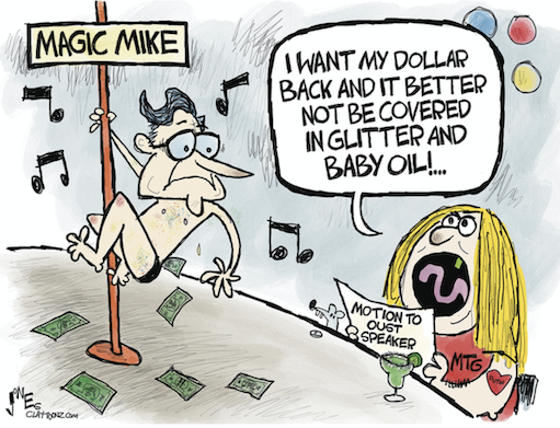 There’s an age-old adage when it comes to the stock market: “Don't try to catch a falling knife." The idea behind this Wall Street axiom is that if a stock is badly dropping in price, don’t buy the stock until it hits rock bottom because it could keep dropping—potentially even going bankrupt.That’s exactly how I feel about the prospect of House Democrats stepping in to save the job of MAGA Speaker Mike Johnson after Rep. Marjorie Taylor Greene filed a motion on Friday to remove Johnson from his position. My advice to Democrats is: Don’t catch a falling Republican. Instead, hope the GOP keeps plummeting in value to the point of bankruptcy. (After all, the GOP Is already morally bankrupt.)