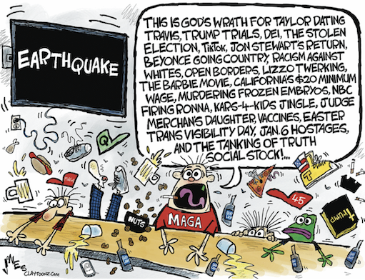 “God is sending America strong signs to tell us to repent. Earthquakes and eclipses and many more things to come. I pray that our country listens.” — Rep. Marjorie Taylor Greene (R-GA) saying the earthquake felt around New York City this morning was a warning from God. https://twitter.com/mtgreenee/status/1776282144416972941