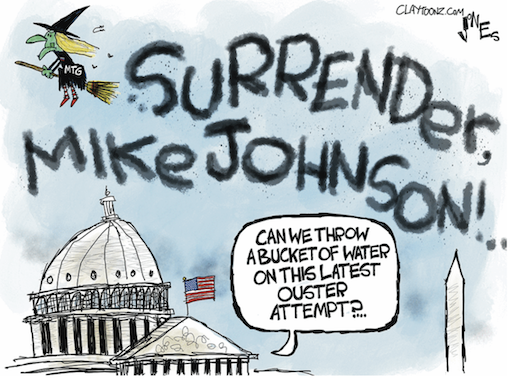 “I just told Mike Johnson in a conference that I’m cosponsoring the Motion to Vacate that was introduced by Greene. He should pre-announce his resignation (as Boehner did), so we can pick a new Speaker without ever being without a GOP Speaker.” — Rep. Thomas Massie (R-KY) announced he will co-sponsor a resolution to oust Speaker Mike Johnson (R-LA). https://thehill.com/homenews/house/4596862-massie-backs-greene-effort-to-oust-speaker-johnson/