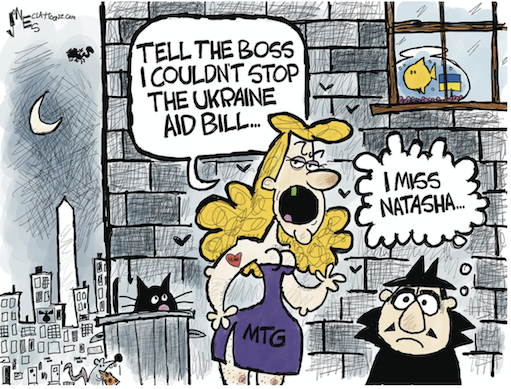 “Mike Johnson’s speakership is over. He needs to do the right thing to resign and allow us to move forward in a controlled process. If he doesn’t do so, he will be vacated,” — Rep. Marjorie Taylor Greene on Sunday said House Speaker Mike Johnson “betrayed” Republican voters after the House approved new aid to Ukraine, threatening to call a vote for his ouster if he doesn’t resign. https://www.cnn.com/2024/04/21/politics/marjorie-taylor-greene-calls-on-johnson-to-resign-after-house-approves-ukraine-aid/index.html
