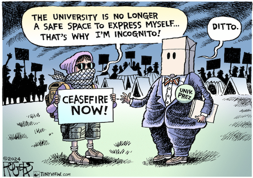 “The widely reported slaughter of innocent Israelis and Palestinians, and the taking of hostages, prompted the protests in the first place. Now, the cries of demonstrators are the story. But we can certainly pay attention on both fronts, even if one of them requires a lot more work and emotional girding. It’s our moral imperative to pay attention or risk becoming bystanders as another dark chapter on wartime atrocities writes itself.” — Lorraine Ali. https://www.latimes.com/entertainment-arts/tv/story/2024-04-29/arguments-over-how-we-protest-war-horrors-get-more-attention-than-the-horrors-themselves