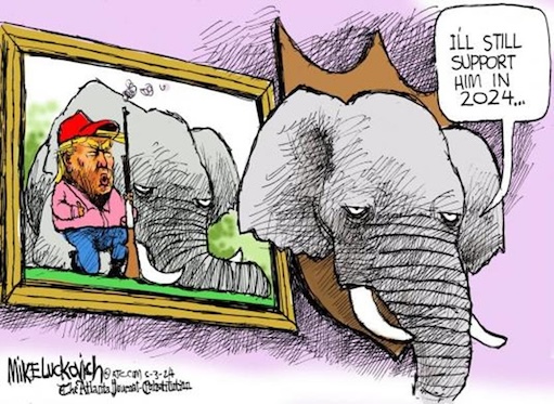Courtesy of Donald Trump, America continues its journey into the political twilight zone.MAGA world has stood with Trump—in fact, its support for him has deepened—through everything he has done, including encouraging the January 6 mob to kill his vice president and being found liable for sexually assaulting and defaming a woman. And those are just a fraction of his legal and moral transgressions. Yet Republicans have never been close to taking the exit ramp away from the former president. The closer we get to November’s election, the more emphatically they will defend him.